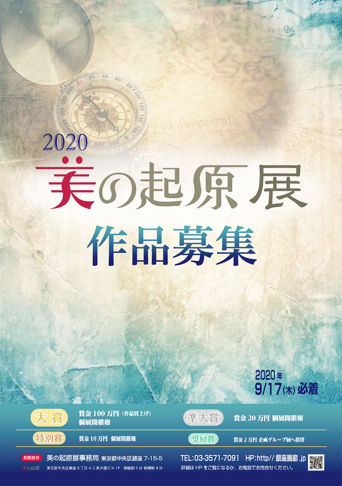銀座画廊、美の起原(DARWINグループ、株式会社セルピエーロ・ダーウィン)では、「2020年美の起原展」を開催、作品を募集中です。18際以上の方であれば、プロ・アマ問わず、誰でも応募が可能です。