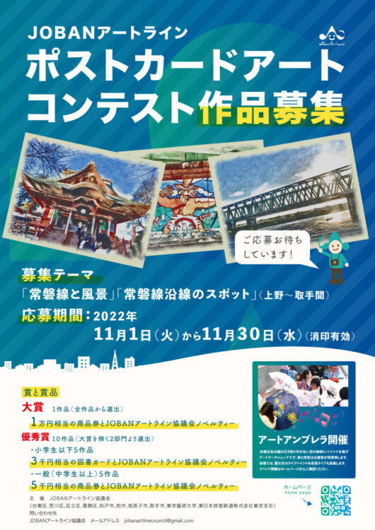 JOBANアートライン(構成:台東区、荒川区、足立区、葛飾区、松戸市、柏市、我孫子市、取手市、東京藝術大学、東日本旅客鉄道株式会社東京支社)では、「ポストカードアートコンテスト」を開催、2022年11月1日(火)より作品を募集します。