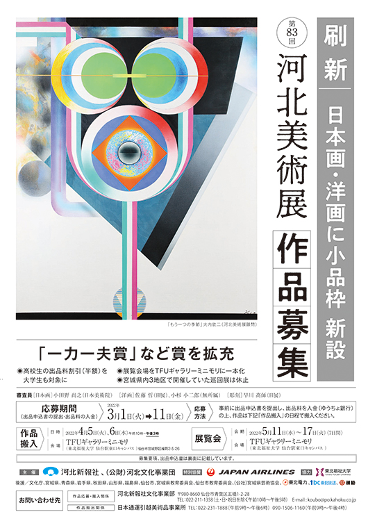 (株)河北新報社(宮城県仙台市)では、「第83回 河北美術展(2022)」を開催、作品を募集中です。