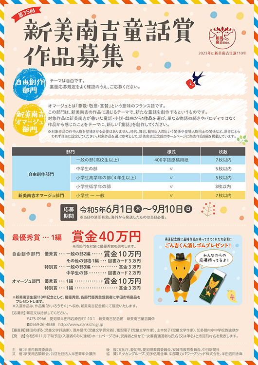 半田市教育委員会(愛知県半田市)では、「第35回 新美南吉童話賞」を開催、作品を募集中です。