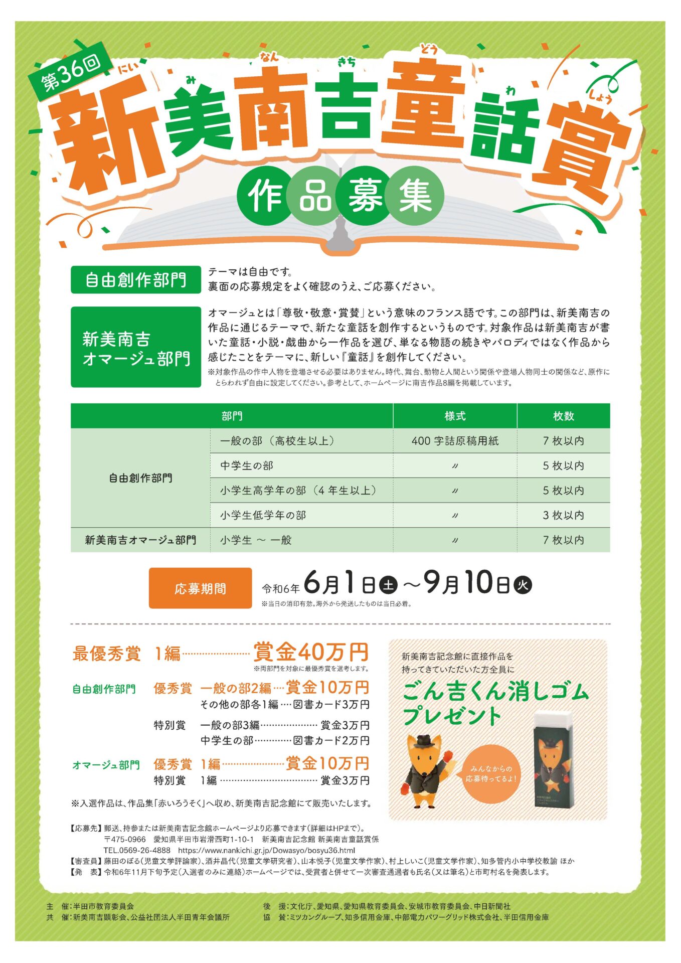半田市教育委員会(愛知県半田市)では、「第36回 新美南吉童話賞」を開催、作品を募集中です。