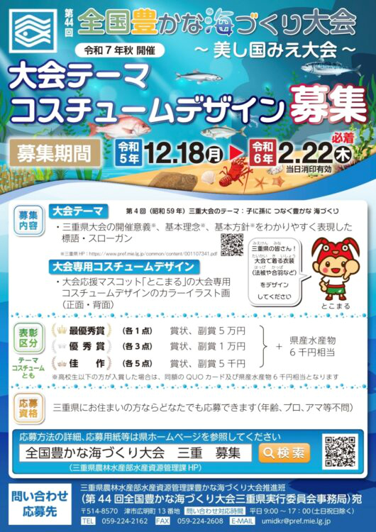 三重県農林水産部水産資源管理課(第44回全国豊かな海づくり大会三重県実行委員会事務局)では、「第44回 全国豊かな海づくり大会~美し国みえ大会~」 の大会テーマおよび大会専用コスチュームデザインを募集しています。