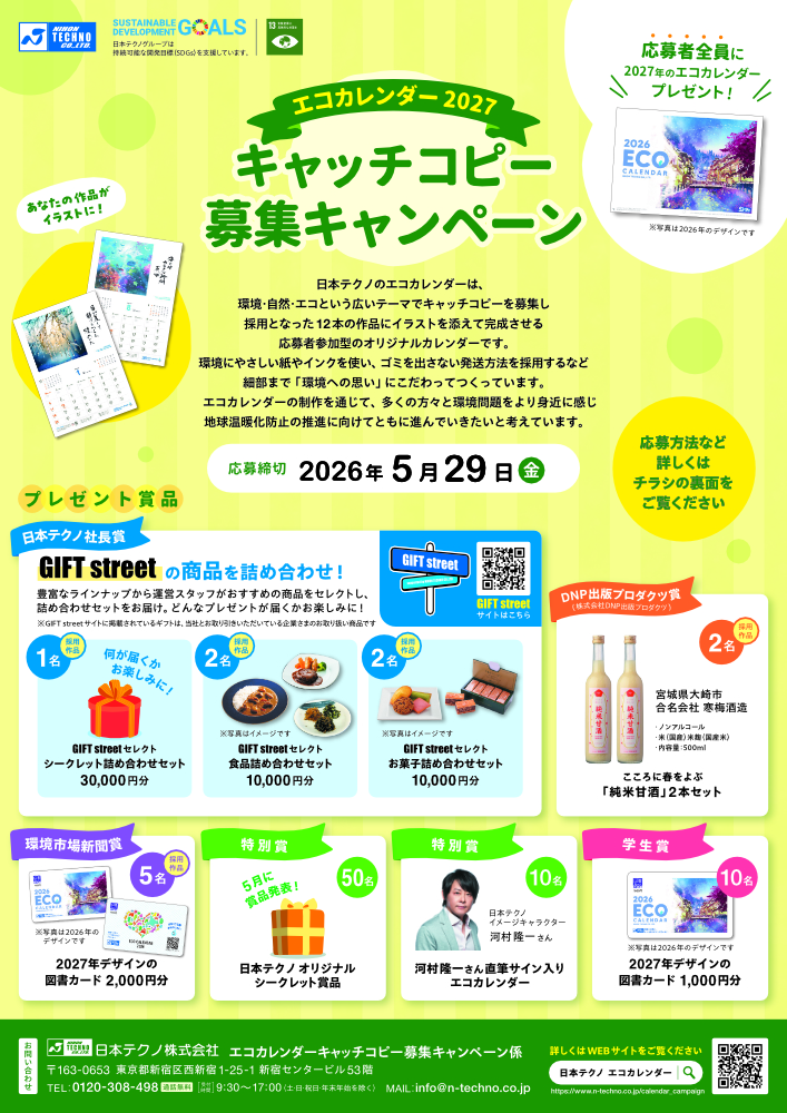 日本テクノ株式会社│あなたの作品がイラストに! エコカレンダー2027 キャッチコピー募集キャンペーン[賞 GIFT streetセレクト詰め合わせセット3万円分ほか]