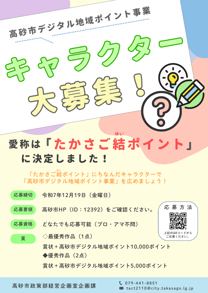 兵庫県高砂市では、市のデジタル地域ポイント事業「たかさご結(ゆい)ポイント」について、キャラクターデザインを募集中です。