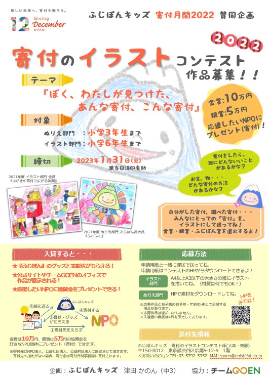 ふじぽんキッズ・チームGOEN(東京都渋谷区)では、「寄付のイラストコンテスト2022」を開催、ぬりえ部門は小学3年生までの方を対象に、イラスト部門は小学6年生の方を対象に作品を募集中です。