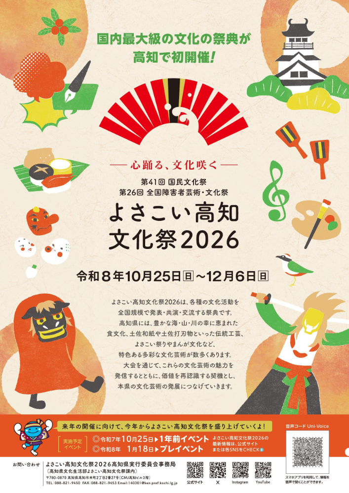 ※「よさこい高知文化祭2026」は、第41回 国民文化祭、第26回 全国障害者芸術・文化祭の統一名称であり、地域の文化資源等の特色を活かした国内最大級の『文化の祭典』です。