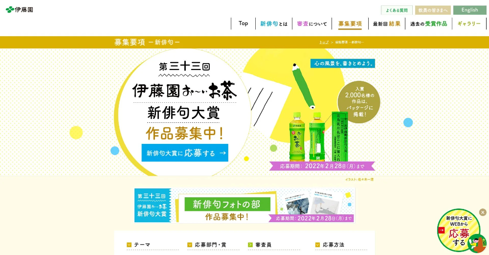 伊藤園新俳句大賞実行委員会では、「第三十三回 伊藤園 お〜いお茶 新俳句大賞」を開催、作品を募集中です。