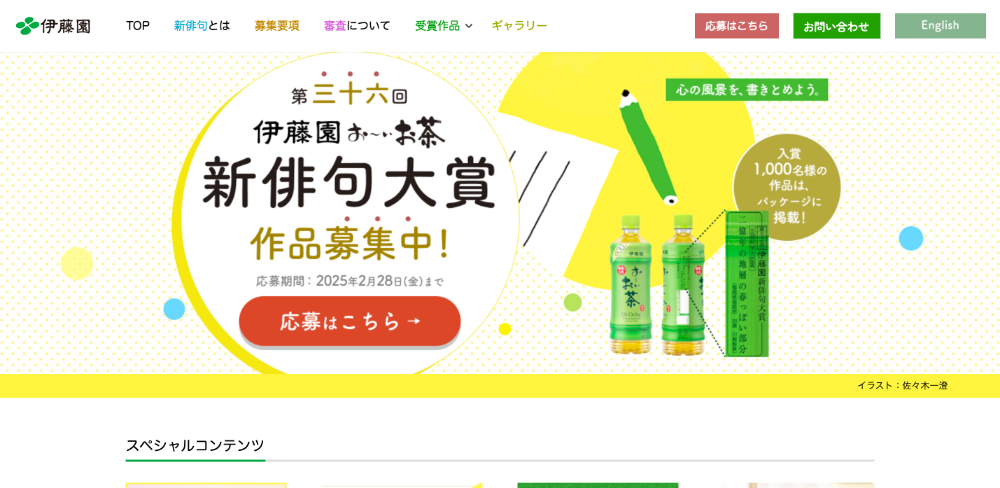 伊藤園新俳句大賞実行委員会(東京都千代田区)では、「第三十六回伊藤園お〜いお茶新俳句大賞」を開催、作品を募集中です。