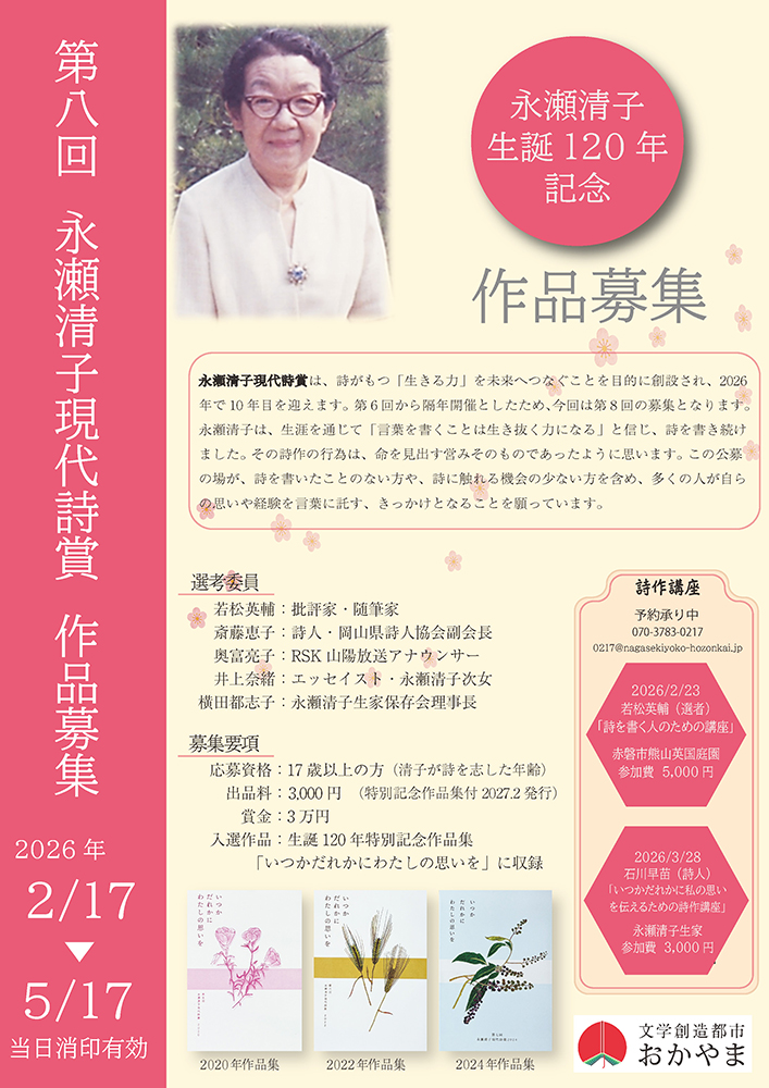 NPO法人永瀬清子生家保存会(岡山県赤磐市)では、「第八回(2025年度)永瀬清子現代詩賞」を開催、2026年2月17日(土)より作品を募集します。