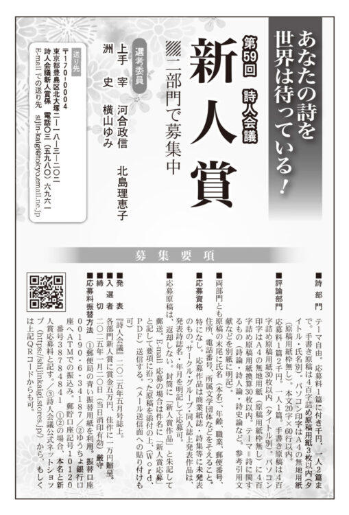 ※E-mail応募の場合は件名に「新人賞応募」と記して要項に沿った原稿を添付の上(Word、PDF)、送信する(詩部門はメール送信面への貼り付けも可)。