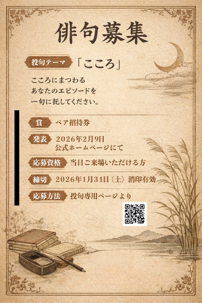 この公演にあわせて、「こころ」をテーマにした俳句を募集します。