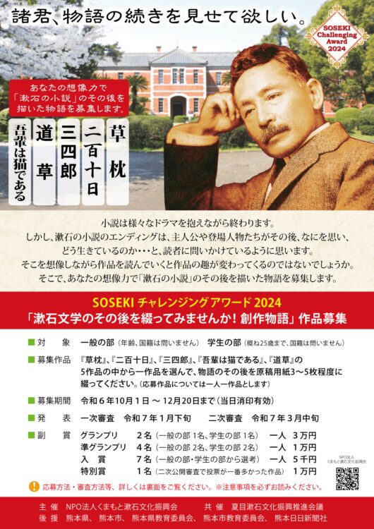NPO法人くまもと漱石文化振興会では、「SOSEKI チャレンジングアワード2024 漱石文学のその後を綴ってみませんか! 創作物語」を開催、作品を募集中です。