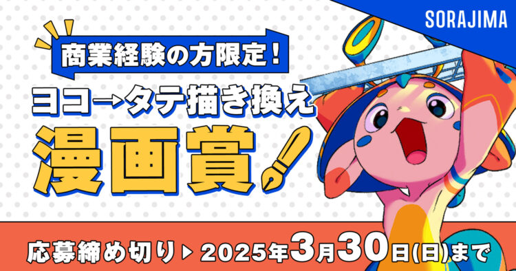 株式会社ソラジマ(東京都港区)では、「商業経験ありの方限定!ヨコ→タテ描き換え 漫画賞」を開催、国内在住・商業誌(WEB商業誌含む)に連載・読切で掲載されたことがある方を対象に作品を募集中です。