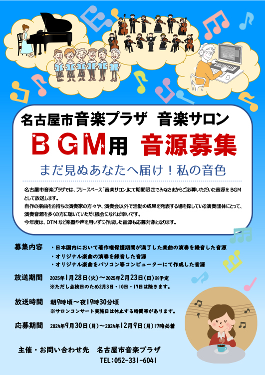 採用された場合、2025年1月28日(火)~2025年2月23日(日)の9時頃から19時30分頃の間に名古屋市音楽プラザの音楽サロン内にて音源を放送いたします。