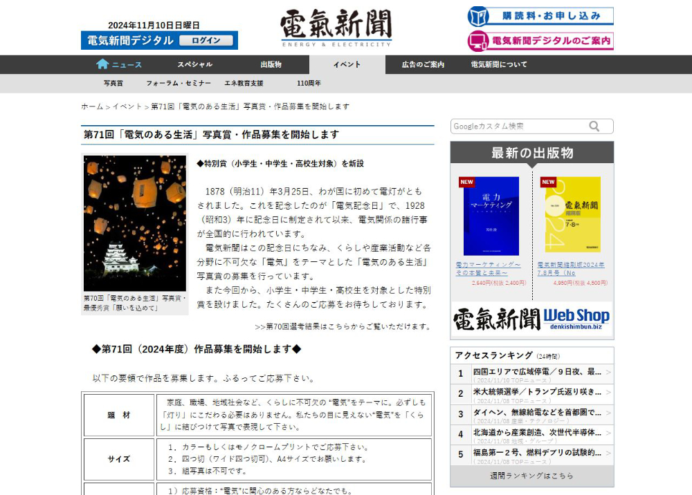電気・エネルギーの専門紙 電気新聞(一般社団法人日本電気協会新聞部・東京都千代田区)では、「第71回『電気のある生活』写真賞」を開催、作品を募集中です。