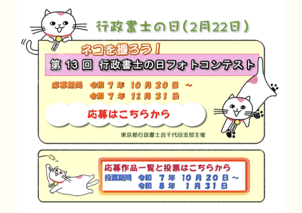 東京都行政書士会千代田支部では、「ネコを撮ろう! 第13回 行政書士の日フォトコンテスト」を開催、作品を募集中です。