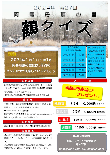 釧路市タンチョウ鶴愛護会(北海道釧路市)では、「2024年 第27回 鶴クイズ」を開催、解答・参加者を募集中です。