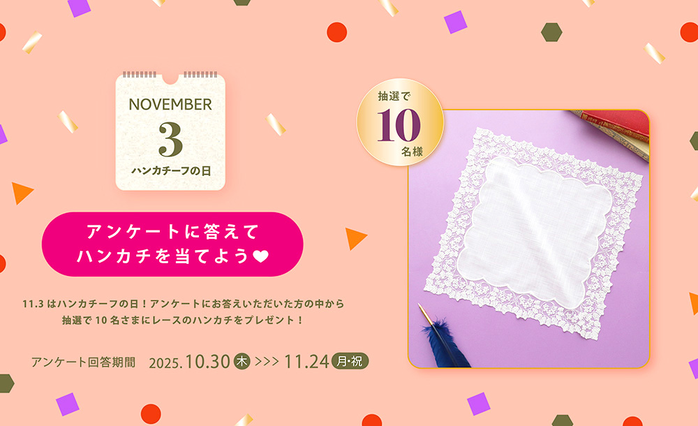 2025年10月30日(木)~11月24日(月・祝)まで、「ハンカチーフの日」を記念して、アンケートの回答者から抽選で10名様にレースのハンカチをプレゼントするキャンペーンを実施します!