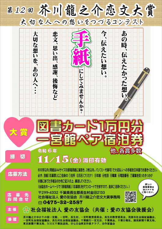 社会福祉法人 愛の友協会(千葉県長生郡長生村)では、「第12回 芥川龍之介恋文大賞 大切な人への想いをつづるコンテスト」を開催、作品を募集中です。