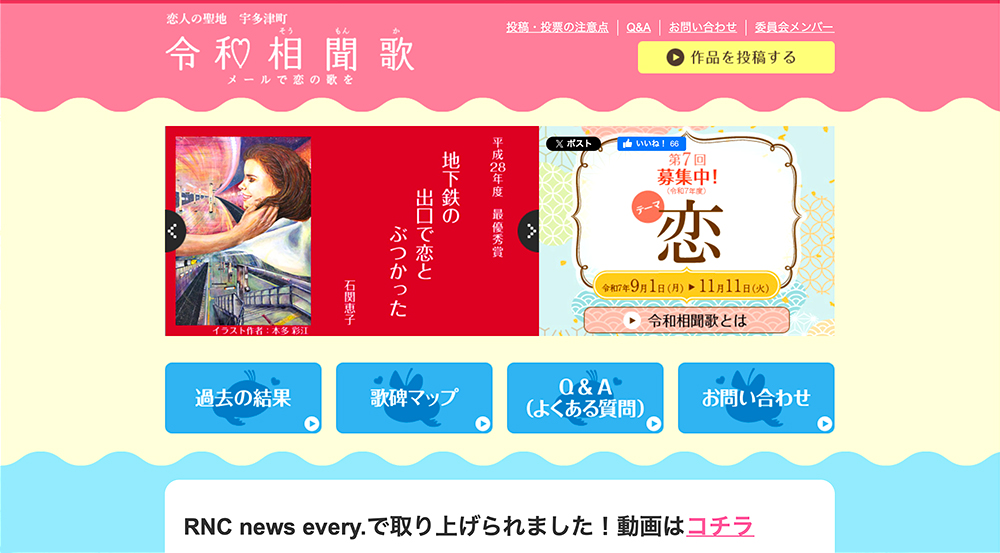 令和相聞歌実行委員会(香川県宇多津町)では、「第6回 令和相聞歌 ~メールで恋の歌を~」を開催、作品を募集中です。