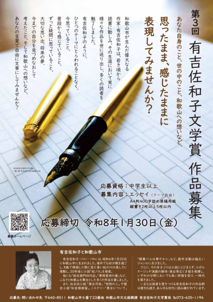 和歌山市(和歌山県)では、「第3回 有吉佐和子文学賞」を開催、中学生以上の方を対象にエッセイを募集中です。