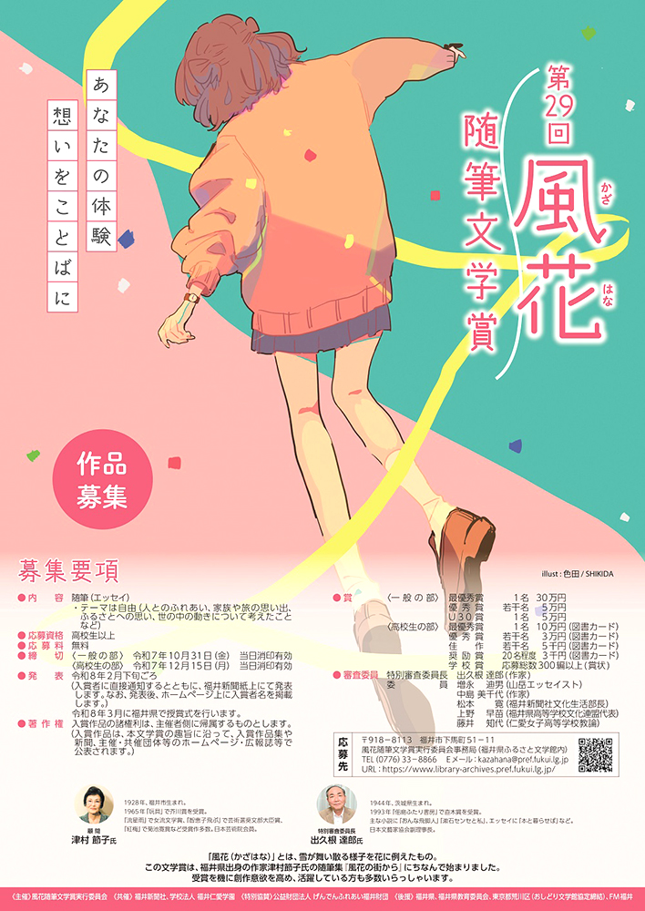 お問い合わせ先:風花随筆文学賞実行委員会事務局(TEL:0776-33-8866/メール:kazahana[a]pref.fukui.lg.jp ※[a]を@に変えて送信)